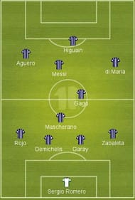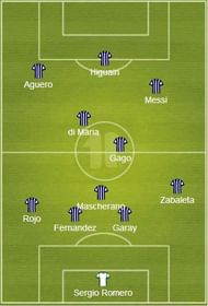 Javier Mascherano is the deepest lying mid-fielder in the squad, whose main duty is to protect the back four. Fernando Gago is used as the link between defence and attack, while tireless attacker Angel di Maria is seen working just behind the front three.