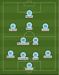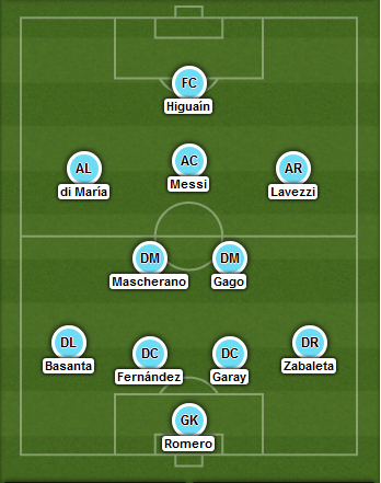 Argentina (4-3-3): Romero; Zabaleta, Garay, Fernandez, Basanta; Gago, Mascherano, Di Maria; Lavezzi, Messi, Higuain.