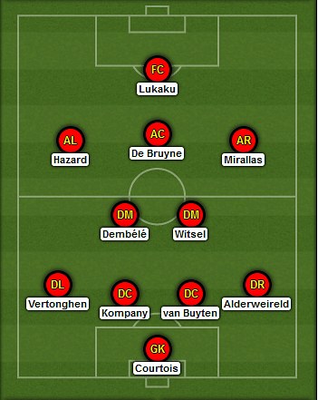 Belgium (4-2-3-1): Courtois; Alderweireld, van Buyten, Kompany, Vertonghen; Dembele, Witsel; Mirallas, De Bruyne, Hazard; Lukaku.