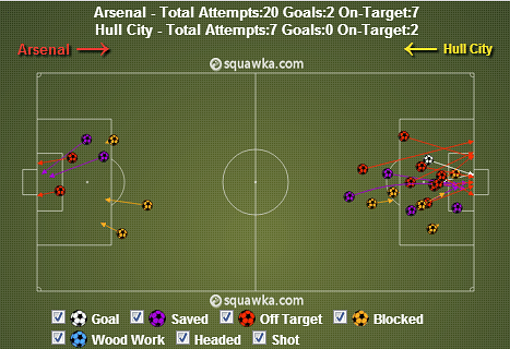 Hull City have been ineffective in trying to play the ball in the oppositions half, and had to stay put in their own half for most of the period of the match. And their fewer attempts at goal only go on to show how strong the Arsenal defence has grown over the season. A look at the shots on goal, by both teams will show us exactly how effectively the Arsenal midfield combined together and took their chances.
