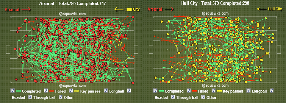 Arsenal seemed pretty comfortable throughout the match, making a total of 795 passes and managed 717 completed passes. Whereas Hull City managed to complete just 298 passes throughout the match. A look at both the teams passing is shown in the figure below.
