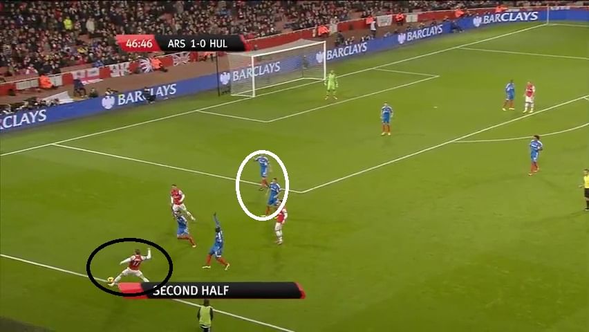 Hull City players seemed to have switched off, thinking the ball had gone out and Ramsey and Özil took advantage of this, and played a one two between them, with Özil losing his marker in the box and calmly putting the ball in the back of the net.
