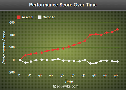 Wilshere made sure that Arsenal led in Performance Score from the opening whistle to full-time, with the Gunners’ steady climb throughout indicative of their ascendancy as Marseille remained relatively stagnant in hovering just below the zero mark.