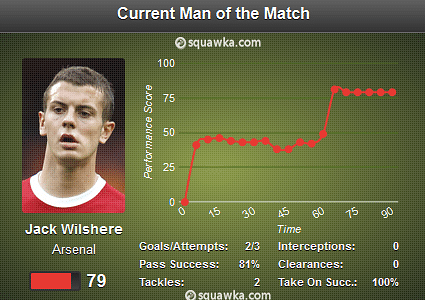 Jack Wilshere came away with Man of the Match honours on the back of his delightful double, finishing the contest with a Squawka Performance Score of 79.