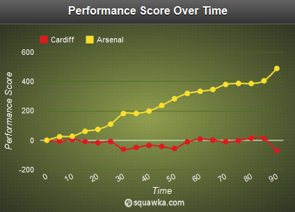 By the 85th minute Arsenal were already far in the ascendancy at 405-12, with Flamini’s goal the death knell for Cardiff and Ramsey’s second punctuating the victory as the away club emerged astronomically on top in the Performance Score battle at 489 to -71.