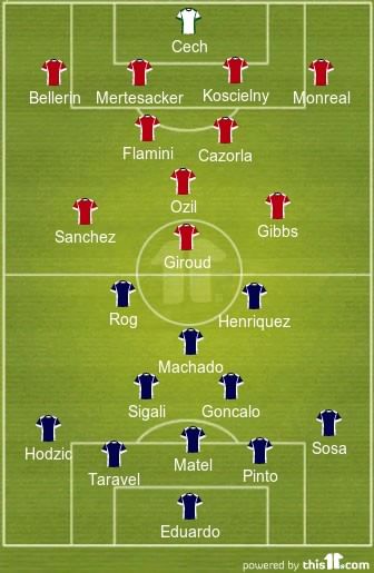Arsenal (4-2-3-1): Cech, Bellerin, Mertesacker, Koscielny, Monreal, Cazorla, Flamini, Sanchez, Ozil, Gibbs, Giroud.