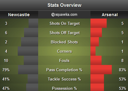 Arsenal just edged the shots count by ten to nine and they had more shots on target with five. The London side also shaded the possession by 53 to 47 but what the statistics really show us is the closeness of the game. Aside from corners (where Newcastle were up by three) the teams are very evenly matched in every department. The game was close throughout with each team enjoying spells of dominance without taking a firm grip on proceedings.