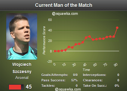 Tomas Rosicky had a very good game in the middle of the park in the absence of Aaron Ramsey racking up the third highest Performance Score of the match with 32. He won both of his take ons and finished with a passing accuracy of 86%. He helped out on the defensive side as well, making two interceptions and winning two tackles.