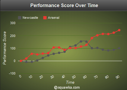 The Performance Score timeline reflects the game’s openness and cagey nature. The teams started fairly solidly and Arsenal seemed to just about edge the majority of the first-half. However at the break Newcastle had just crept in front although only eight points separated the two sides.