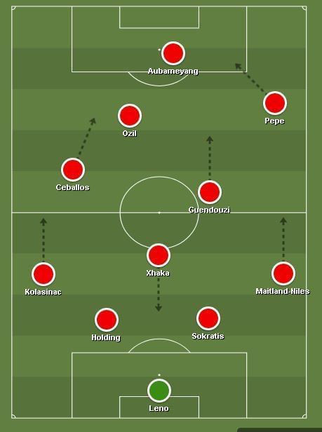Bernd Leno, Ainsley Maitland-Niles, Sokratis, Rob Holding, Sead Kolašinac, Granit Xhaka, Matteo Guendouzi, Dani Ceballos, Mesut Özil, Nicolas Pepe, Pierre Emerick-Aubameyang.
