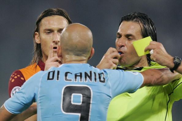 Referee Paparesta (R) gives the yellow card to Lazio’s Paolo Di Canio, flanked by AS Roma’s Francesco Totti during an Italian Serie A match AS Roma-Lazio in Rome 23 October 2005. (Getty Images)