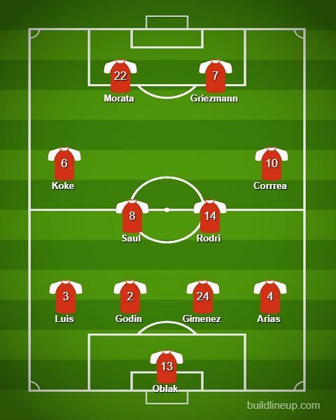 Atletico Madrid: Jan Oblak, Santiago Arias, Jose Gimenez, Diego Godin, Filipe Luis, Rodri, Saul Niguez, Koke, Angel Correa, Antoine Griezmann, Alvaro Morata.