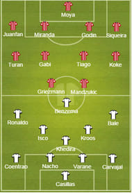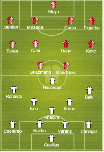 Both the teams fielded a lineup with 4 changes from their previous matches. The home team, Atletico Madrid made 2 changes in defence and 2 in midfield. Jesus Gamez and Jose Maria Gimenez were replaced by Joao Miranda and Juanfran in the back 4. In midfield, captain Gabi returned along with Arda Turan to replace Saul and Raul Garcia.