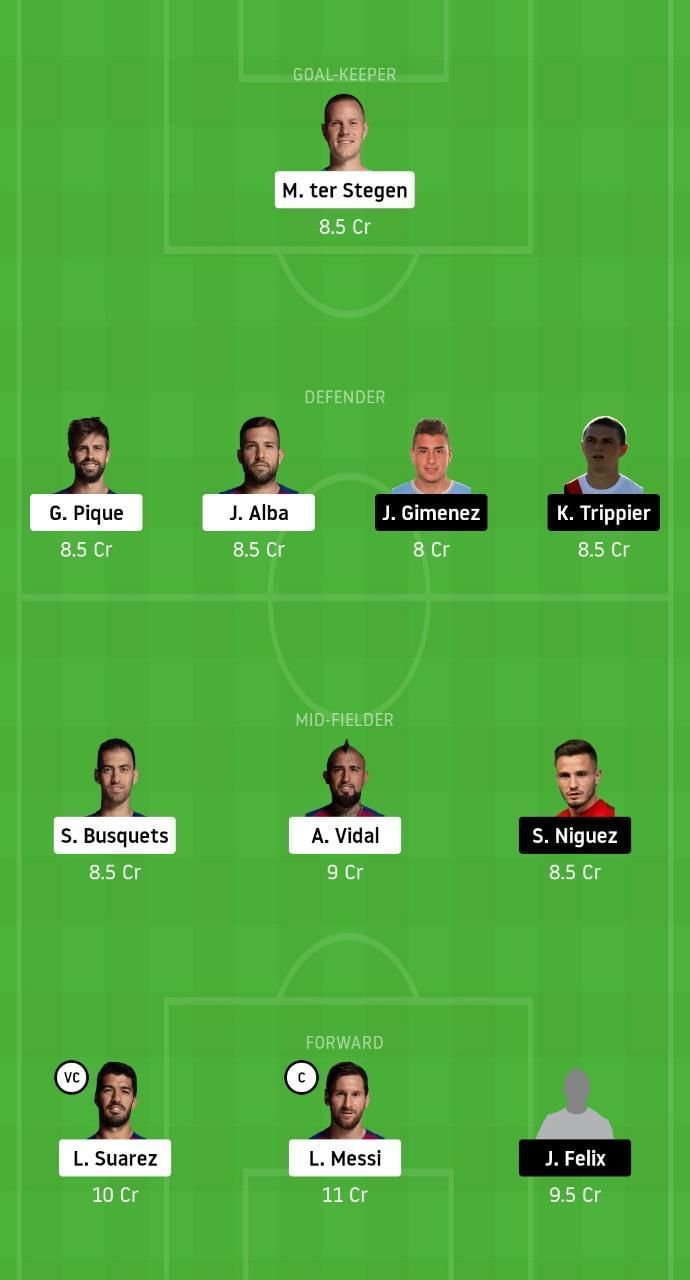 Fantasy Suggestion #1: Marc-Andre ter Stegen; Kieran Trippier, Gerard Pique, Jose Gimenez, Jordi Alba; Sergio Busquets, Arturo Vidal, Saul Niguez; Joao Felix, Luis Suarez, Lionel Messi