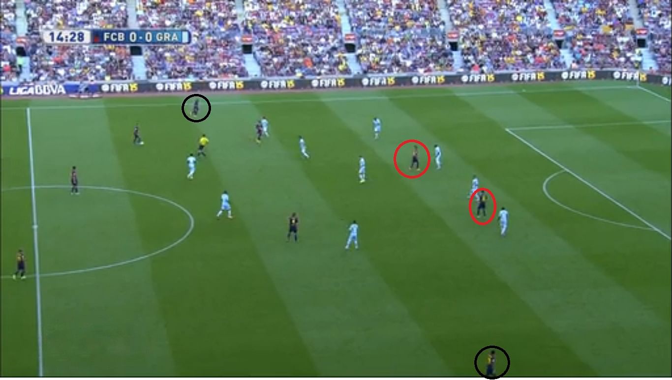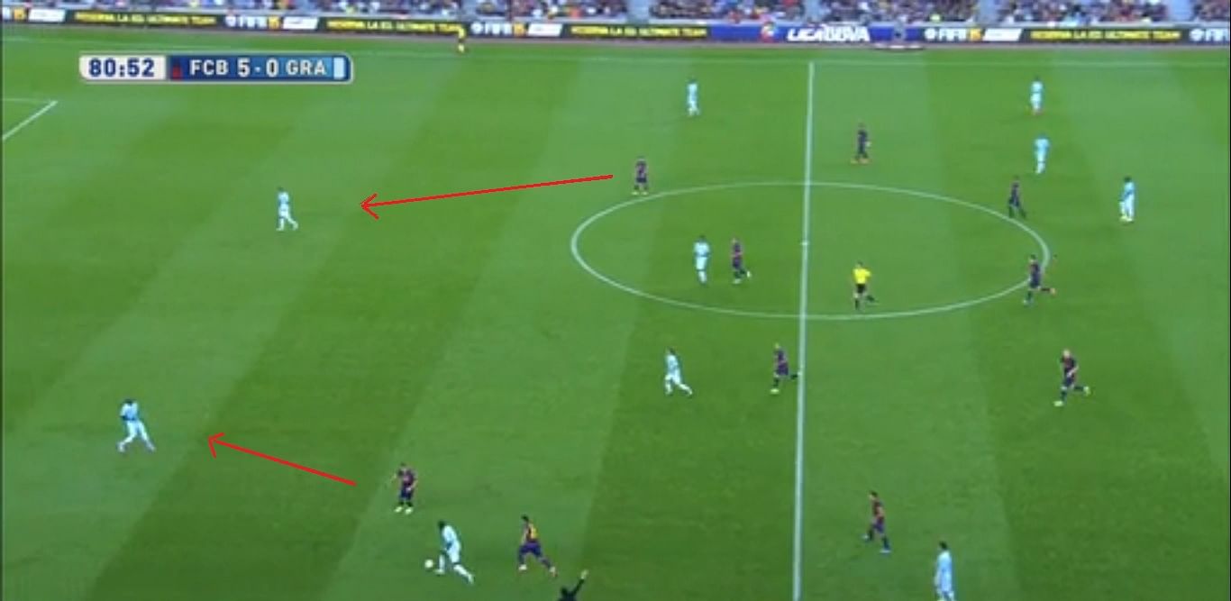 As mentioned earlier, the full backs acquire a very high position up the pitch and if the Catalans lose possession in the attacking third, then the opposition just have Mathieu and Mascherano to go at on the counter. So Barcelona simply cannot afford to give much time to their opposition if caught off possession as it can pose a serious threat and this justifies the high pressing that Enrique has deployed.