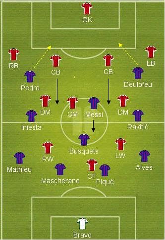 The midfield can be manned by the trio of Andrés Iniesta, Ivan Rakiti? and Sergio Busquets, with Iniesta and Rakiti? moving forward consistently to support the strike line.