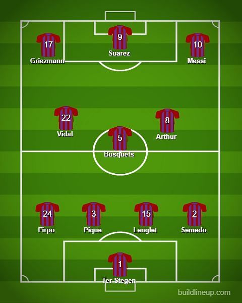 Barcelona Predicted Lineup (4-3-3): Ter Stegen; Firpo, Pique, Lenglet, Semedo; Arthur, Busquets, Vidal; Griezmann, Suarez, Messi