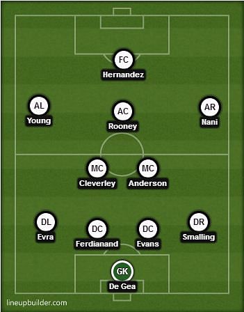 4-2-3-1: De Gea; Evra, Ferdinand, Evans, Smalling; Cleverley, Anderson; Young, Rooney, Nani; Hernandez