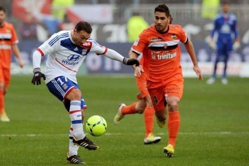 Lyon’s Steed Malbranque (L) keeps the ball away from Lorient’s Arnaud Le Lan on February 24, 2013 in Lyon. Seven-time champions Lyon pulled level on points with Paris Saint-Germain at the top of Ligue 1 with a come-from-behind 3-1 victory over Lorient.