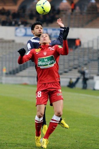 Bordeaux’s Benoit Tremoulinas and Brest’s Florian Raspentino go head to head on February 24, 2013 at Chaban Delmas Stadium in Bordeaux. Brest defeated Bordeaux 2-0.