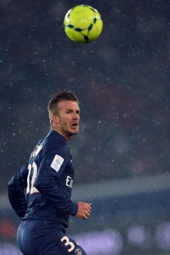 David Beckham eyes the ball during PSG‘s game against Olympique de Marseille in Paris on Sunday. The former Manchester United and Real Madrid star, on a five-month contract, made a cameo debut appearance from the bench at the weekend, setting up the second goal in a 2-0 league win over Marseille which put the capital club three points clear.
