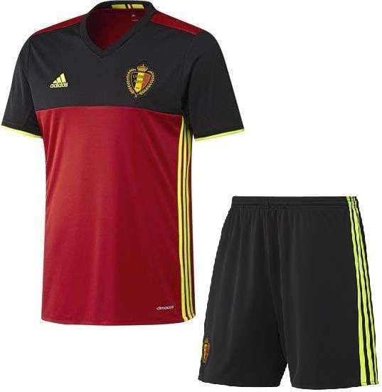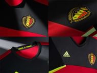 The new Belgium home kit incorporates the colours of the Belgium Flag in an eye-catching design. The home shirt is primarily red with a block of black across the chest. The sleeves also bear the black colour of the flag.