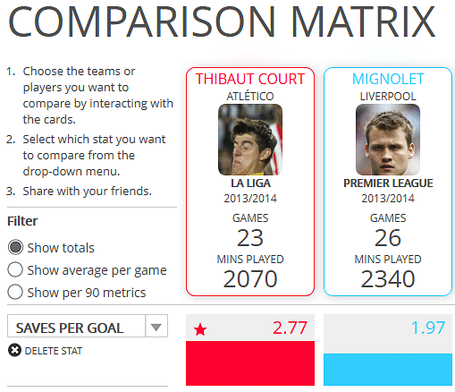 Thibaut Courtois has made 2.77 saves per goal he has conceded this season. Simon Mignolet has made 1.78 saves per concession for Liverpool on the other hand.