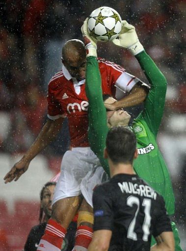 Celtic’s English goalkeeper Fraser Forster catches the ball past Benfica’s Brazilian defender “Luisao” Silva during the UEFA Champions League football match SL Benfica vs Celtic FC at the Luz Stadium in Lisbon. Benfica won 2-1.