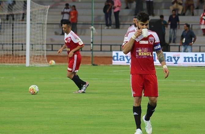 A self-proclaimed fan of Chelsea FC, Virat Kohli played an important part in the All Hearts XI comeback last evening. Here are a couple of images which show the 27-year-old Indian Test captain fighting it out against the Bollywood Brigade.