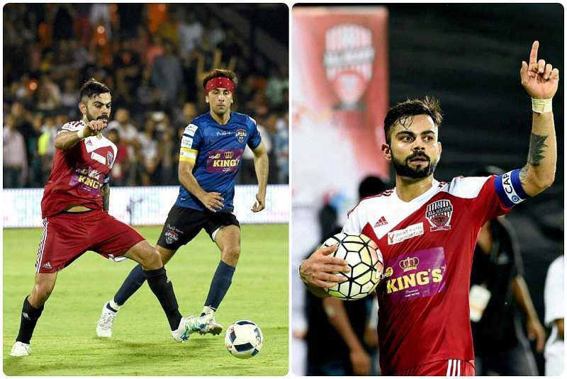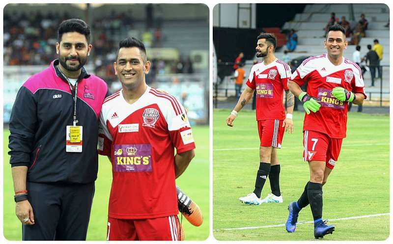 Despite having conceded a couple of early goals, the Virat Kohli-led All Hearts XI side fought back valiantly to end the match at 2-2. Although, Yuvraj Singh and KL Rahul were at the heart of the All Hearts XI comeback, here are a couple of images which show Mahendra Singh Dhoni flaunting his goalkeeping skills and Virat Kohli with the ball at his feet.