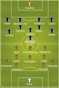 Borussia Dortmund (4-3-3): Burki; Piszczek, Sokratis, Hummels, Schmelzer; Gundogan, Ginter, Castro; Mkhitaryan, Aubameyang, Reus.