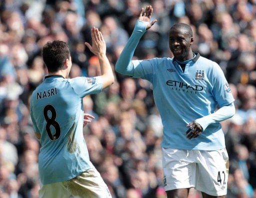 Manchester City midfielder Yaya Toure (R) celebrates his goal against West Ham with midfielder Samir Nasri during their English Premier League match in Manchester on April 27, 2013. Sergio Aguero and Toure scored a pair of fine goals as Manchester City began life as former Premier League champions by winning 2-1 at home to West Ham.