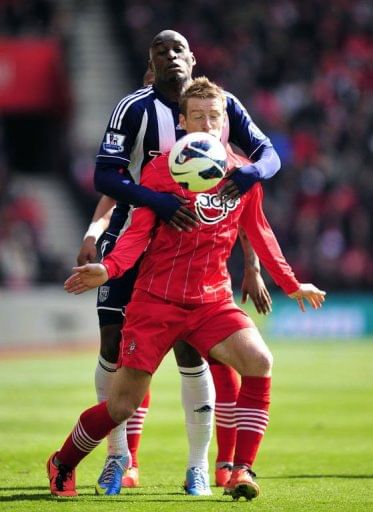 Southampton’s midfielder Steven Davis (R) clashes with West Bromwich Albion’s striker Marc-Antoine Fortune during their English Premier League football match at St Mary’s Stadium in Southampton, southern England, on April 27, 2013. Fortune scored one goal and made another but was then sent off as West Bromwich Albion won 3-0 at Southampton, who ended the game with nine men.