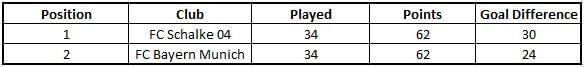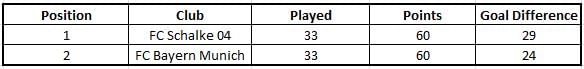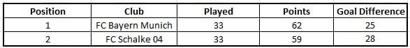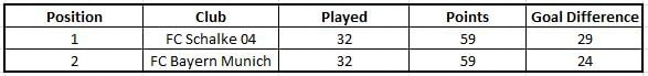 The league table at this point looked like this and as things stood, the title was Schalke’s due to their superior goal difference.