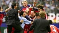 93rd minute, Hamburg: Bayern are desperately looking for a breakthrough, but Effenberg’s through ball to Paulo Sergio is intercepted by Thomas Ujfaluski and he kicks it to his keeper Schober. In a moment of madness, Schober picks up the ball with his hand after the back pass and the Bayern bench abruptly erupts in protest. The referee Markus Merk gives Bayern an indirect free kick inside the penalty area.