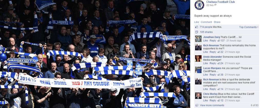 2) The second one, is probably not forgivable on any level. The individual who controls Chelsea’s Facebook page, posted a picture of Cardiff fans at their home stadium, and mistook them for away Chelsea fans during the Premier League game on Sunday. Failure to recognise your own fans, is just so wrong, on so many levels.