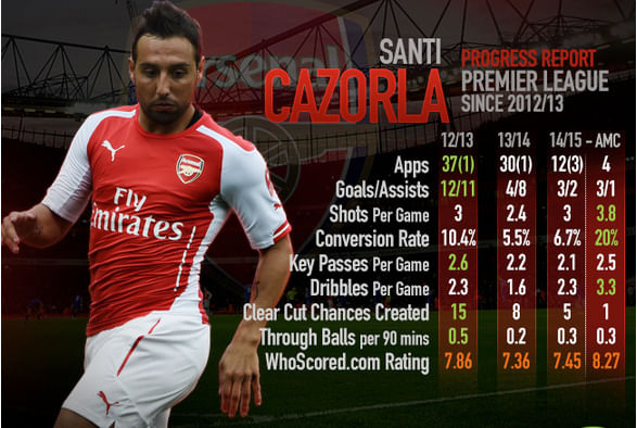 With an average of 3.3 successful dribbles and 2.5 key passes per game in his 4 league appearances in the number 10 role this season, Cazorla is rediscovering his best form in the centre.