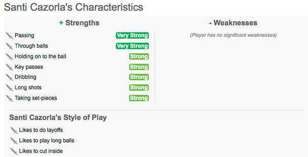 What aids Cazorla in these situations is that he is two-footed. Strong with both his left and right feet, defenders are unsure whether he will go to the byline and attempt to put in a cross for the striker or cut inside and go for goal himself, which adds to his unpredictability.