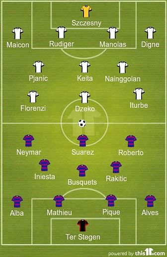Barcelona (4-3-3): Ter Stegen, Alves, Pique, Mathieu, Alba, Busquets, Rakitic, Iniesta, Neymar, Roberto, Suarez