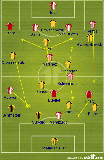 In all probability Reus would be asked to play just behind Lewandowski in attack. This would bring him in direct conflict with the Spanish bulwark Martinez. Both are having stellar first seasons at their new clubs and though they play different roles, their contributions are huge. Unlike Mario Gotze, Reus is more physical, quicker and more direct with his play. While marking Gotze could have been easier, Reus presets very different problems for Martinez. He can drag Martinez out of position and leave the Bayern defence devoid of their shield. If Martinez does not get drawn into Reus, he could easily overload a particular wing and cause the Bayern fullbacks big problems.