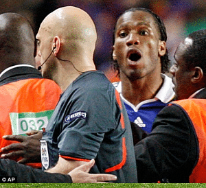 Emotions poured out after the game, with several Chelsea players confronting Øvrebø on the field including substituted Didier Drogba, who was recorded shouting “It’s a f**king disgrace!” into live television cameras.