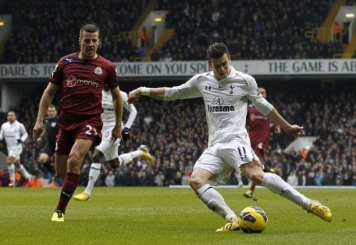 Tottenham Hotspur‘s midfielder Gareth Bale (R) shoots to score his second goal during their English Premier League football match against Newcastle United at White Hart Lane in London on February 9, 2013. Bale maintained his sublime form with a brilliant brace to inspire Tottenham Hotspur’s 2-1 victory over United.