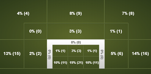 Given that we know one of those down the middle was a tap-in by Andreas Weimann and one down the left was a tap-in by Aron Gunnarsson after Hart had made an initial save, the disproportion of goals down the right is even more exposed.