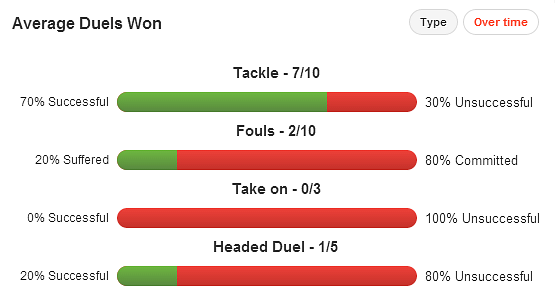 The graph above also suggests another weakness in Coentrao’s game – one which is likely to be capitalised upon by Premier League opposition. In a division renowned for its physicality and the necessity for aerial ability, the Portuguese would certainly have to adapt in order to make a successful transition; he has so far won just one of five attempted headers this year.