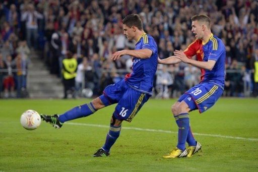 Basel’s Fabian Schaer (L) scores a penalty kick during their Europa League match against Chelsea on April 25, 2013. “Next to trying to win the domestic league title again, the Europa League is like a dessert for us, which we just wanted to enjoy all the way through,” Basel goalkeeper Yann Sommer said.