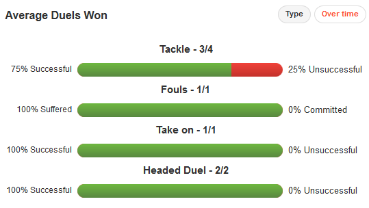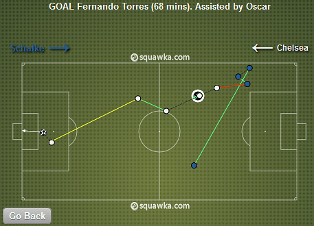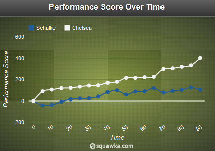 The Performance Score shows that Chelsea were on top from the start. Having taken the lead so early on we’d expect Chelsea to better Schalke here. Although prior to half-time Schalke had a flurry of chances, leading to some top class saves from Petr Cech, which coincided with a narrowing of the gap between the two scores.