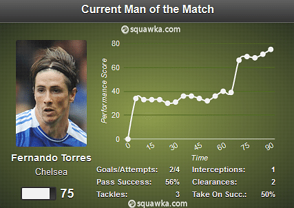 Unsurprisingly Fernando Torres was the Man of the Match in this tie, having scored the opener and crucially killing the game off with his second goal. Torres clinically scored two goals for Chelsea, continuing on from his good European form last year. Although his pass accuracy was awful (56% completion), he was an isolated figure up front at times and ran the line well. His hard work off the ball was also evident as he completed three tackles and made three defensive actions. Torres definitely went a long way to staking a claim for a start against Manchester City.