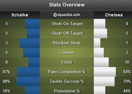 The stats some up what was a very efficient away performance from Chelsea who scored early then sat back (reflected by the superior possession for the home side Schalke). Chelsea soaked up the pressure and looked to hit the German’s on the break, something they did incredibly well on two separate occasions in the second half to win 3-0.