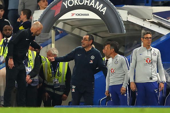 Maurizio Sarri was continuously encroaching the opposition technical area last night. What he was trying to do and whether he did it unknowingly is anyone's guess. But what happened in the final moments of the game was rather surprising. Sarri was sent off by the referee and there was a massive tussle between both the teams.