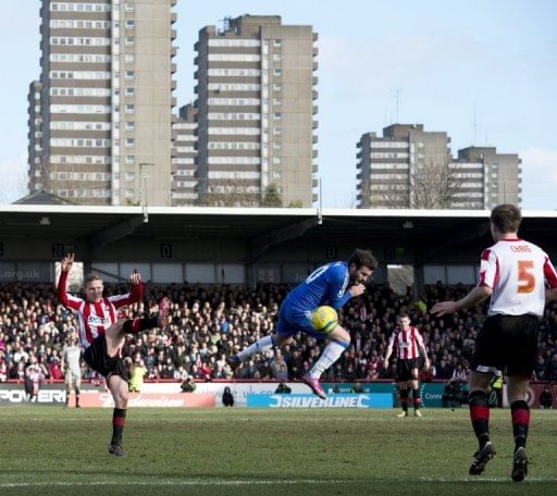 Chelsea’s Juan Mata (C) attempts to block a shot from Brentford’s Adam Forshaw (L) during their FA Cup fourth round 1st leg match at Griffin Park in west London, on January 27, 2013. The game ended in a 2-2 draw. Replay takes place on Sunday at Stamford Bridge.